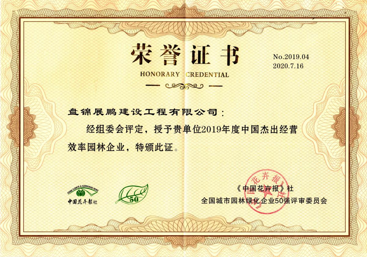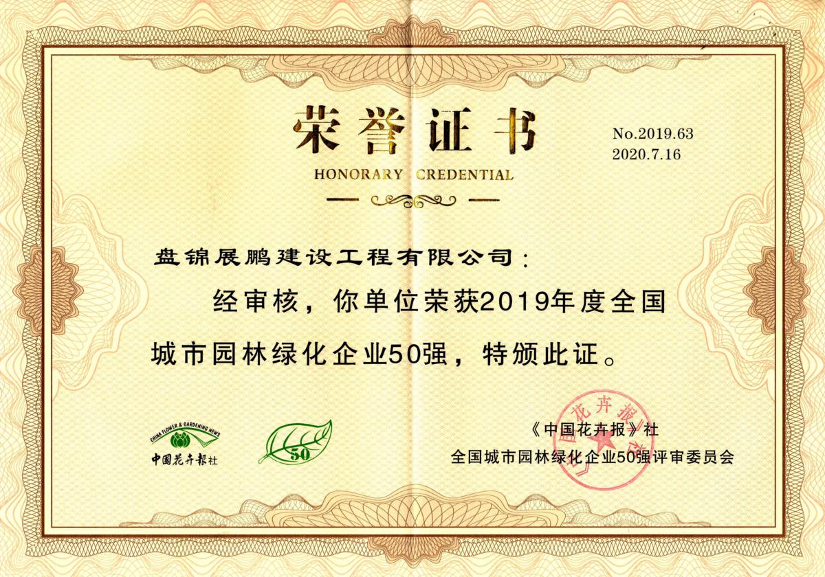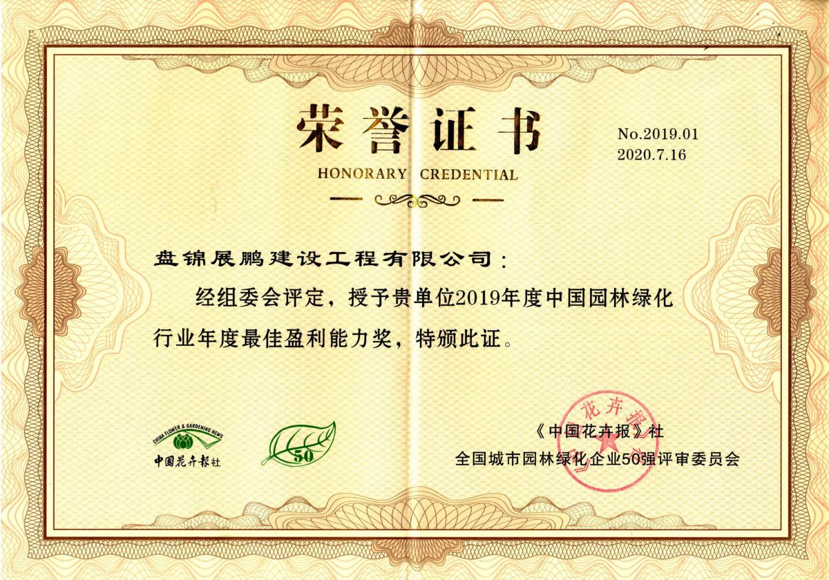 2020年10月17日,2019年度全國城市園林綠化50強頒獎儀式在山東省泰安市舉行。盤錦展鵬建設(shè)工程有限公司憑借2019年58.68%的凈資產(chǎn)收益率獲獎“年度最佳盈利能力獎”,排名第一。